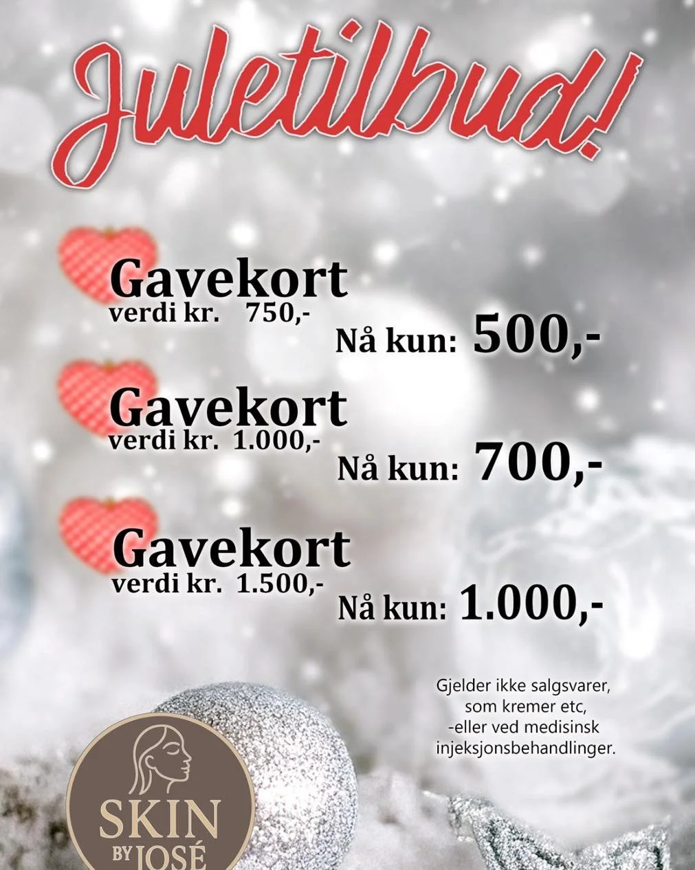 Tilbudet gjelder ikke på salgsvarer som kremer m.m., eller på medisinske injeksjonsbehandlinger.